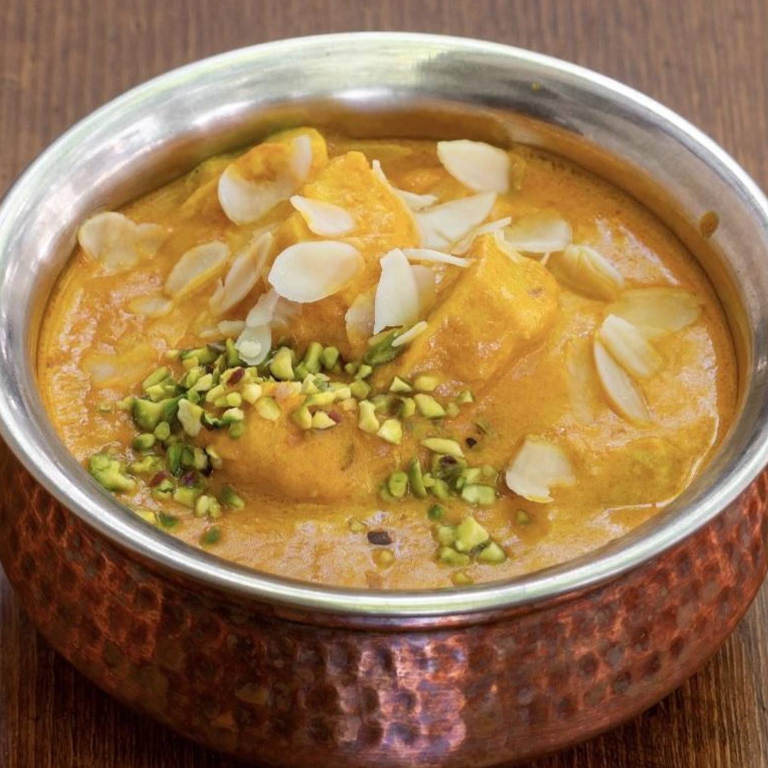 crevettes décortiquées, cuisinées dans une sauce douce aux amandes, noix de cajou, pistaches, crème fraîche